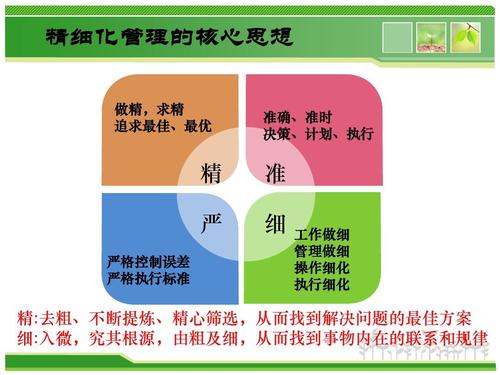 精細(xì)化管理是一種對戰(zhàn)略目標(biāo)進(jìn)行分解細(xì)化和責(zé)任落實(shí)的過程,是讓企業(yè)的戰(zhàn)略規(guī)劃能有效地貫徹到每個環(huán)節(jié)并發(fā)揮作用的過程,是一種貫穿于企業(yè)所有環(huán)節(jié)的全面管理模式,同時也是增強(qiáng)企業(yè)整體執(zhí)行能力,實(shí)現(xiàn)最終發(fā)展目標(biāo)的一個重要途徑。實(shí)施精細(xì)化管理,就是從小事入手,對每個細(xì)節(jié)都精益求精,做到事事有人管、處處有人管、事事有檢查、時時有計劃、事事有總結(jié),杜絕管理上的漏洞,消除管理上的盲點(diǎn),提高管理效能。