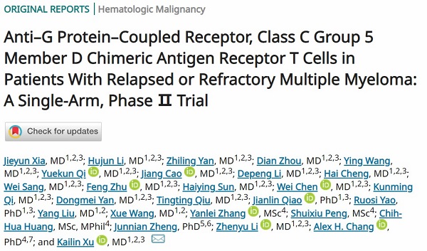 采用該項技術(shù)治療多發(fā)性骨髓瘤的重大醫(yī)學(xué)成果已被國際頂級學(xué)術(shù)期刊《Journal of Clinical Oncology》(影響因子50.717)接收發(fā)表:Anti–G Protein–Coupled Receptor, Class C Group 5 Member D Chimeric Antigen Receptor T Cells in Patients With Relapsed or Refractory Multiple Myeloma: A Single-Arm, Phase Ⅱ Trial1。該研究采用國際領(lǐng)先的GPRC5D CAR-T細(xì)胞治療技術(shù),成功治療了33例復(fù)發(fā)難治性多發(fā)性骨髓瘤患者,并獲得91%的總反應(yīng)率(ORR)的優(yōu)異療效。其中,在既往接受過 BCMA CAR-T細(xì)胞治療的9例患者中,反應(yīng)率為100%。