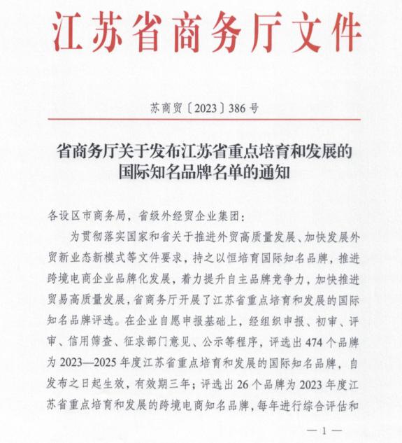 鹽城捷康入選江蘇省商務廳重點培育發展的國際知名品牌