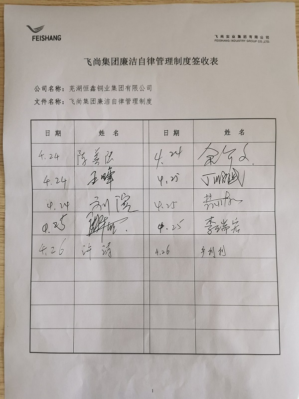 各級領導干部既是廉潔文化建設的參與者,更是廉潔文化建設的組織者、倡導者、示范者。為充分發揮領導干部的示范帶頭作用和導向作用,重視并支持廉潔文化建設,各成員企業首先加強對領導干部的宣傳教育力度,通過《簽收表》確認集團和本企業兩份《廉潔自律管理制度》發放到每一位行政工作人員、班組及以上管理人員,并督促學習貫徹。